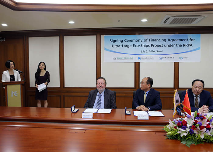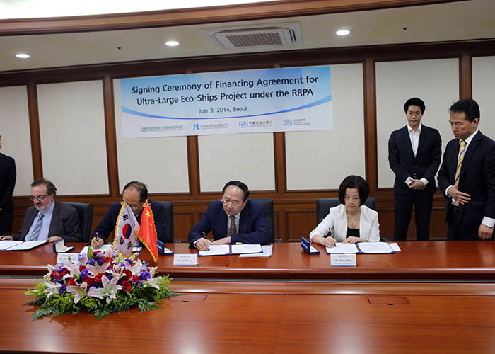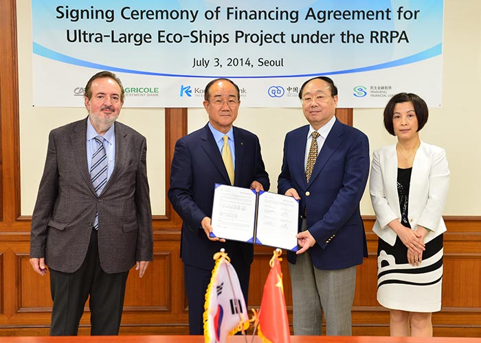 2014年7月3日,在中國國家主席習(xí)近平和韓國總統(tǒng)樸槿惠的共同見證下,中國進(jìn)出口銀行行長李若谷和韓國進(jìn)出口銀行行長李德勛在韓國總統(tǒng)府青瓦臺簽署協(xié)議,由兩家進(jìn)出口銀行在“互惠風(fēng)險(xiǎn)參與協(xié)議”項(xiàng)下聯(lián)合向民生金融租賃旗下子公司提供船舶項(xiàng)目貸款。