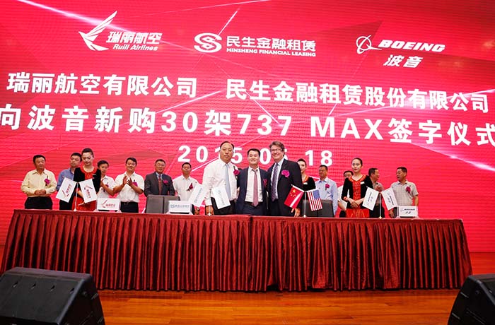 2015年5月18日,民生金融租賃股份有限公司(簡稱“民生租賃”)聯(lián)合瑞麗航空有限公司(簡稱“瑞麗航空”)與美國波音公司(The Boeing Company,簡稱“波音公司”)在云南瑞麗簽署30架波音737MAX飛機購買意向協(xié)議,合同總價約30.6億美元。民生租賃飛機租賃事業(yè)部副總裁王福厚、瑞麗航空董事長董勒成、波音金融公司副總裁Mr. John Bruns共同參加簽字儀式。