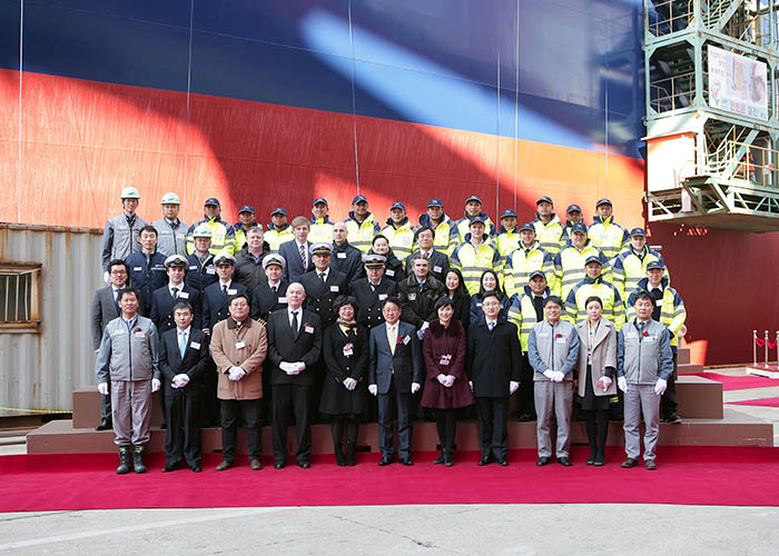 2016年3月11日,我公司在韓國(guó)三星重工有限公司(以下簡(jiǎn)稱“韓國(guó)三星重工”)訂造的9300標(biāo)箱2117號(hào)集裝箱船舶建造完工,成功交付法國(guó)達(dá)飛集團(tuán)。我公司領(lǐng)導(dǎo)萬曉芳及船舶事業(yè)部總經(jīng)理鄧毅等一行出席了該船的命名儀式。萬曉芳作為教母,將船舶命名為“CMA CGM JACQUES JUNIOR”,并在韓國(guó)三星重工常務(wù)副總裁M.K.Ha先生的陪同下見證了牧師對(duì)該船舶的祈?;顒?dòng),隨后參觀考察了船廠。